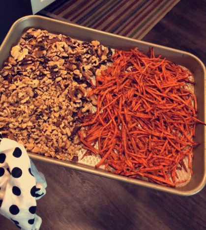 4. Roast carrots and walnuts for 12 minutes, then allow to cool for 10 minutes.