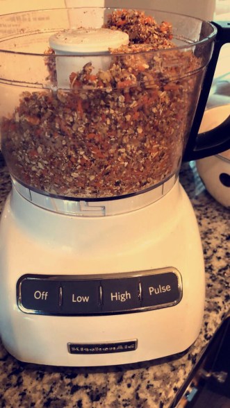 6. Once carrots and walnuts are cooled, add to food processor. Place a new sheet of parchment paper on your baking sheet. Process the mixture until it forms a sticky dough. It should stick together – if not, adding 2-3 dates will help with this.