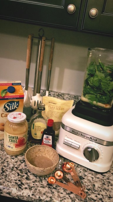3. In a food processor or blender, combine spinach, maple syrup, almond milk, flax egg, applesauce, and vanilla and process until completely pureed.